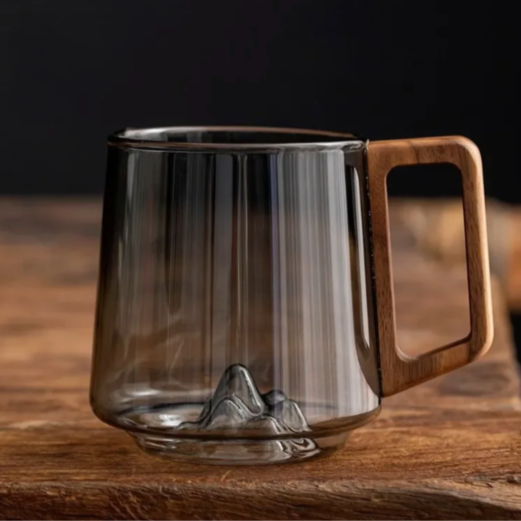 - Moderne rust: De Mountain Peak glazen mok combineert handgemaakt glas met een houten handvat voor een rustige en moderne drinkervaring.