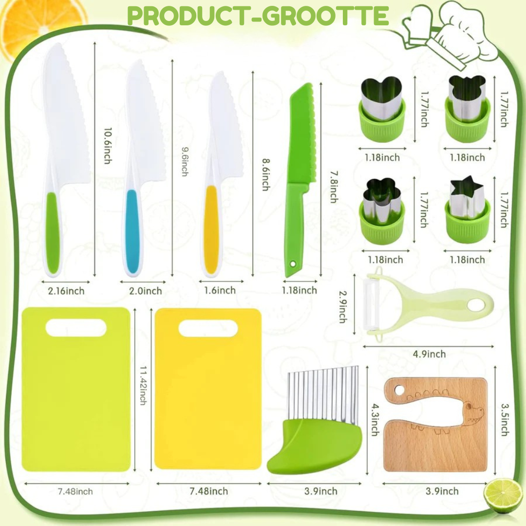 Een complete 13-delige kookset voor kinderen die veilig koken combineert met creativiteit en het ontwikkelen van vaardigheden. Meer dan alleen keukengerei: het is een recept voor verbinding, leren en plezier.